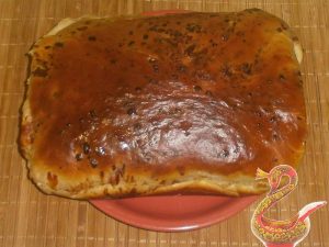 Short form (on a baking cheese bread would turn into a cheese cake) blanketed with baking paper and spread the dough into it. It should be well and evenly, especially in the corners, so the dough all the time tries to curl back into a shapeless lump. Hand it is better oiled, as the dough for this cheese bread is very sticky. So give him just stand in the kitchen for approximately half an hour … about forty minutes.