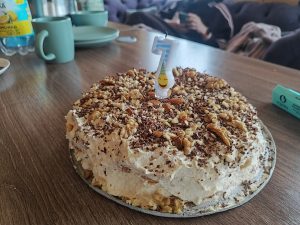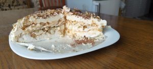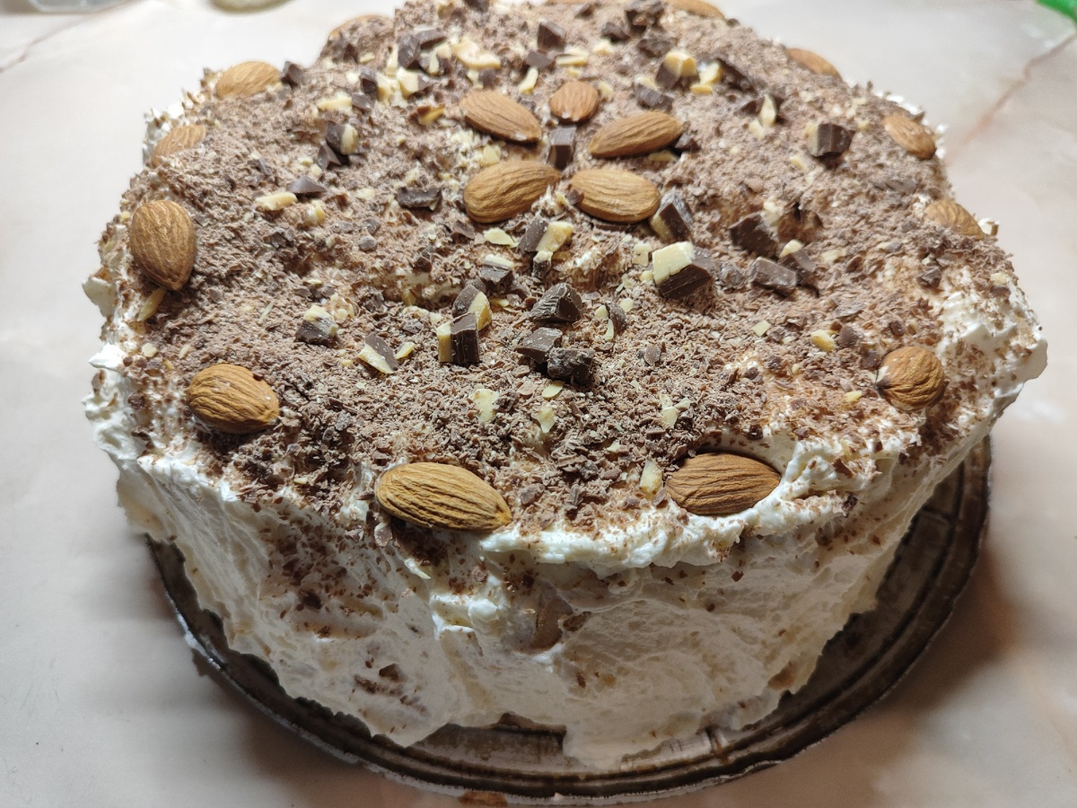 Then we decorate, as your imagination tells you. I usually use grated chocolate and nuts for this. That’s it, the cake is ready. Enjoy your meal.