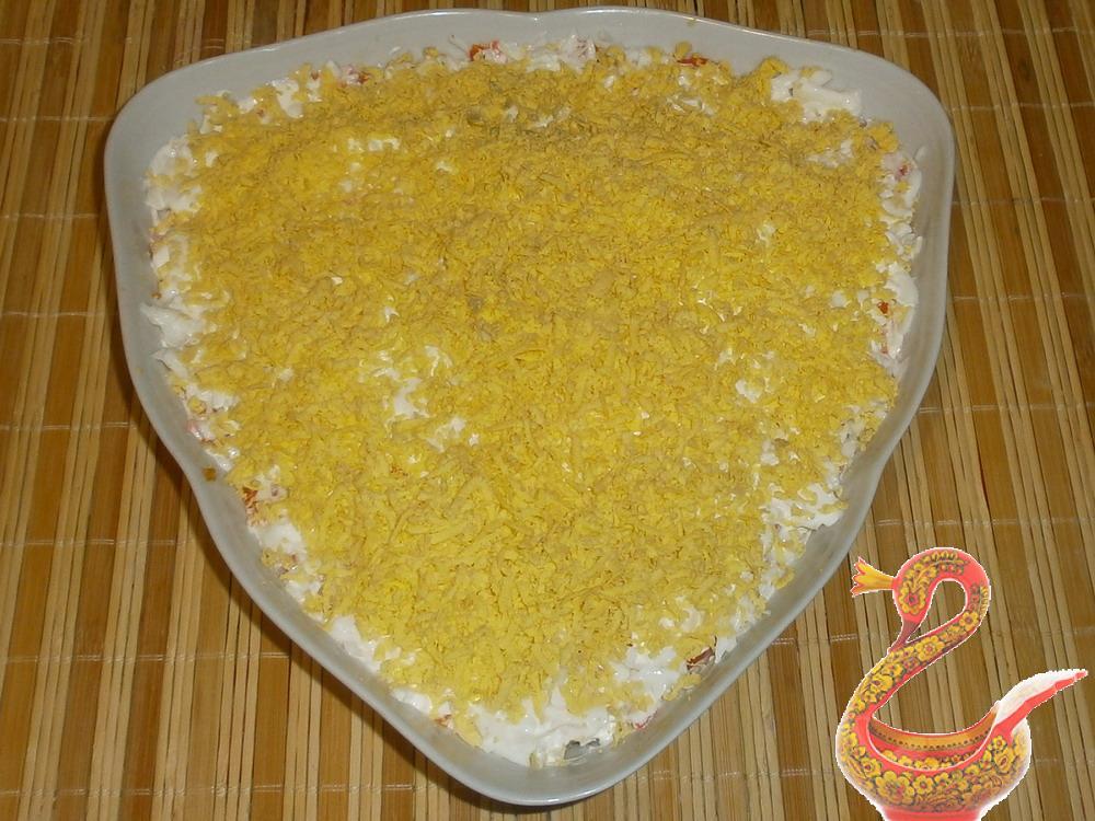 8. Несколько рыбок из шпрот вверх хвостиками помещаем в салат.